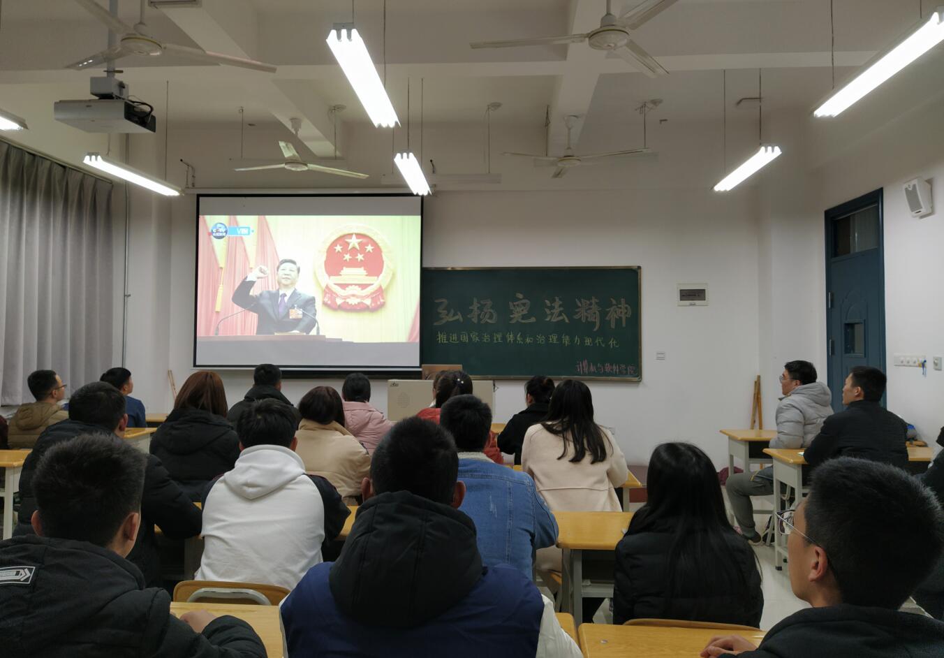 首先,集中观看了《中国国家主席宪法宣誓纪实》视频,这是中国领导人首次进行宪法宣誓,意义深远。随后向仲攀从国家宪法日的来历、设立国家宪法日的目的、设立国家宪法日的意义以及推进国家治理体系和治理能力现代化四个方面进行了讲解。在讨论中同学们纷纷表示,要以此次学习宪法为契机,进一步提高宪法意识,提升敬畏之心,用自己的实际行动学习宪法、遵守宪法、维护宪法、运用宪法。